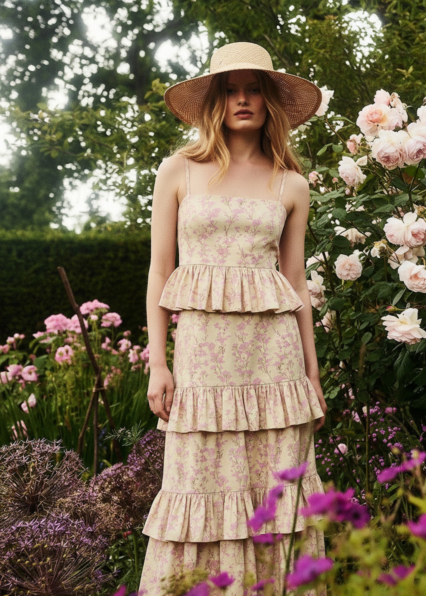 A tribute to feminine transformation — gentle, rooted, and quietlypowerful. Inspired by nature’s poetry, the collection unfolds like a garden in motion: delicate florals, embroidered butterflies, and golden bees breathe life into eachpiece.